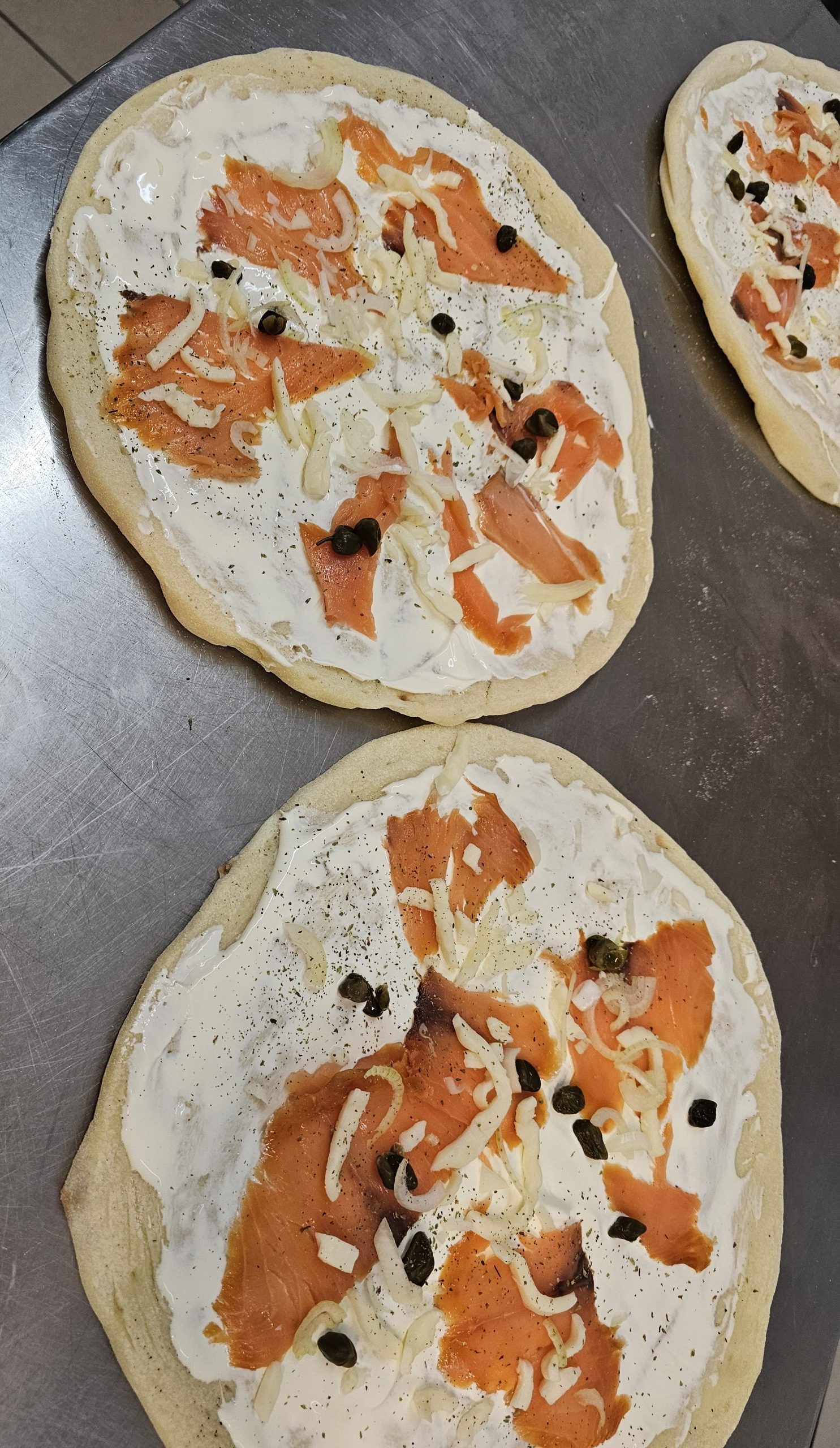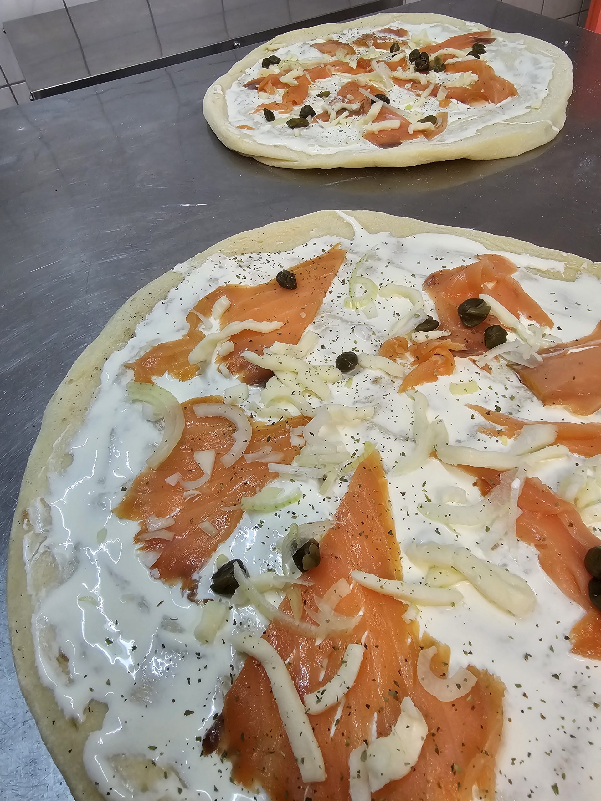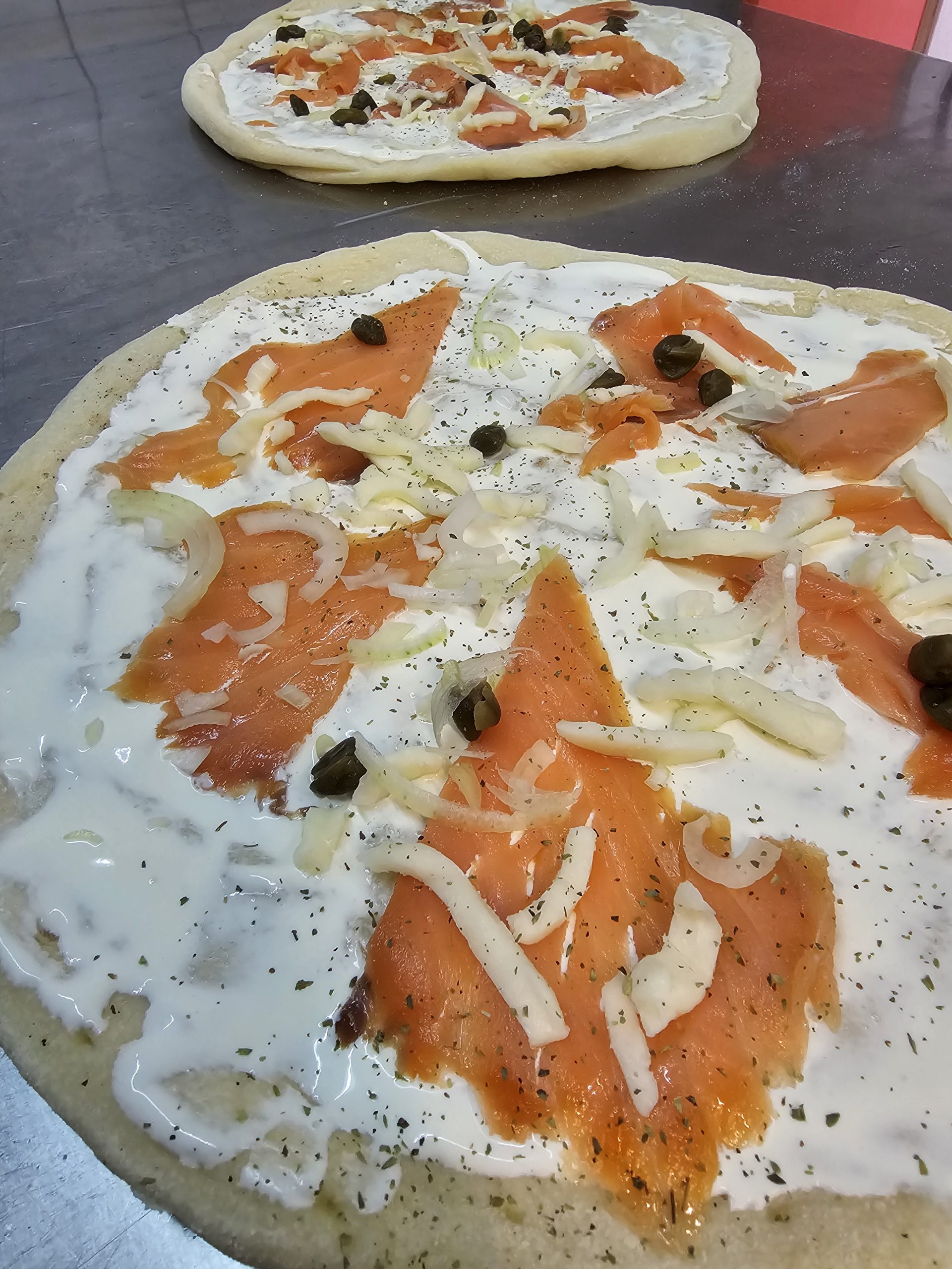 Ingrédient : Pâte à pizza , crème Fraîche, Mozzarella Fior di latte, Saumon, oignons, câpres, origan