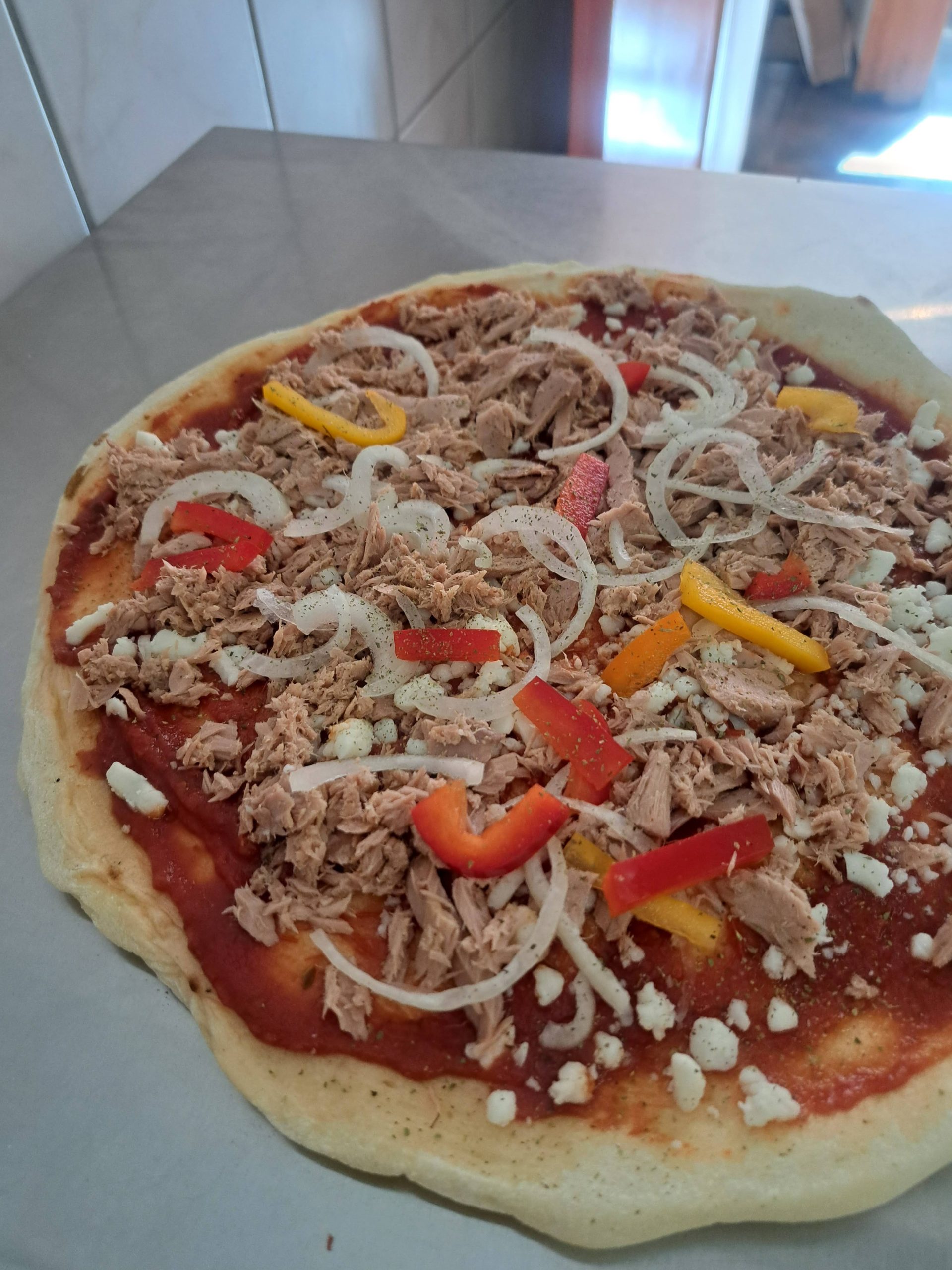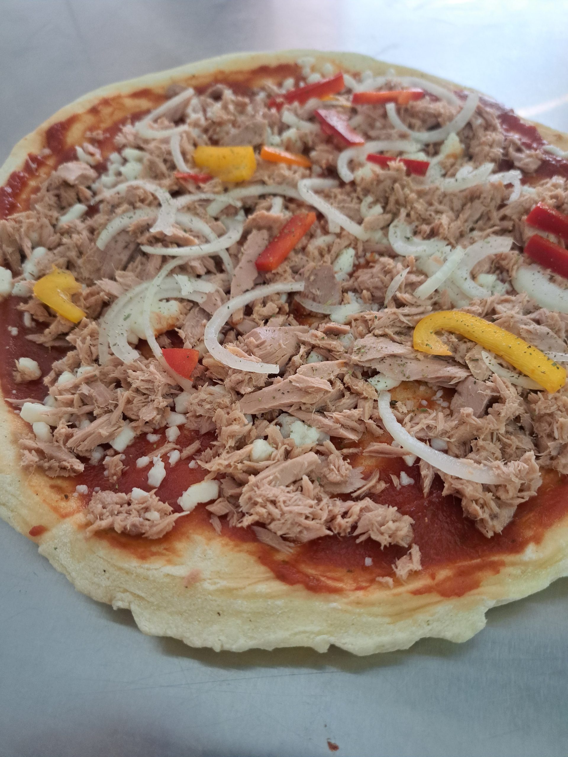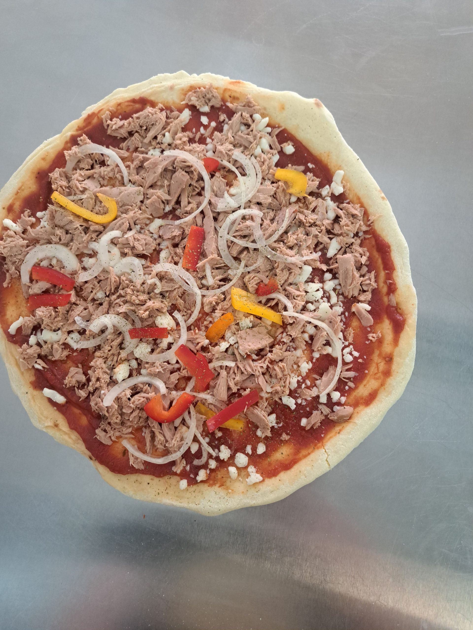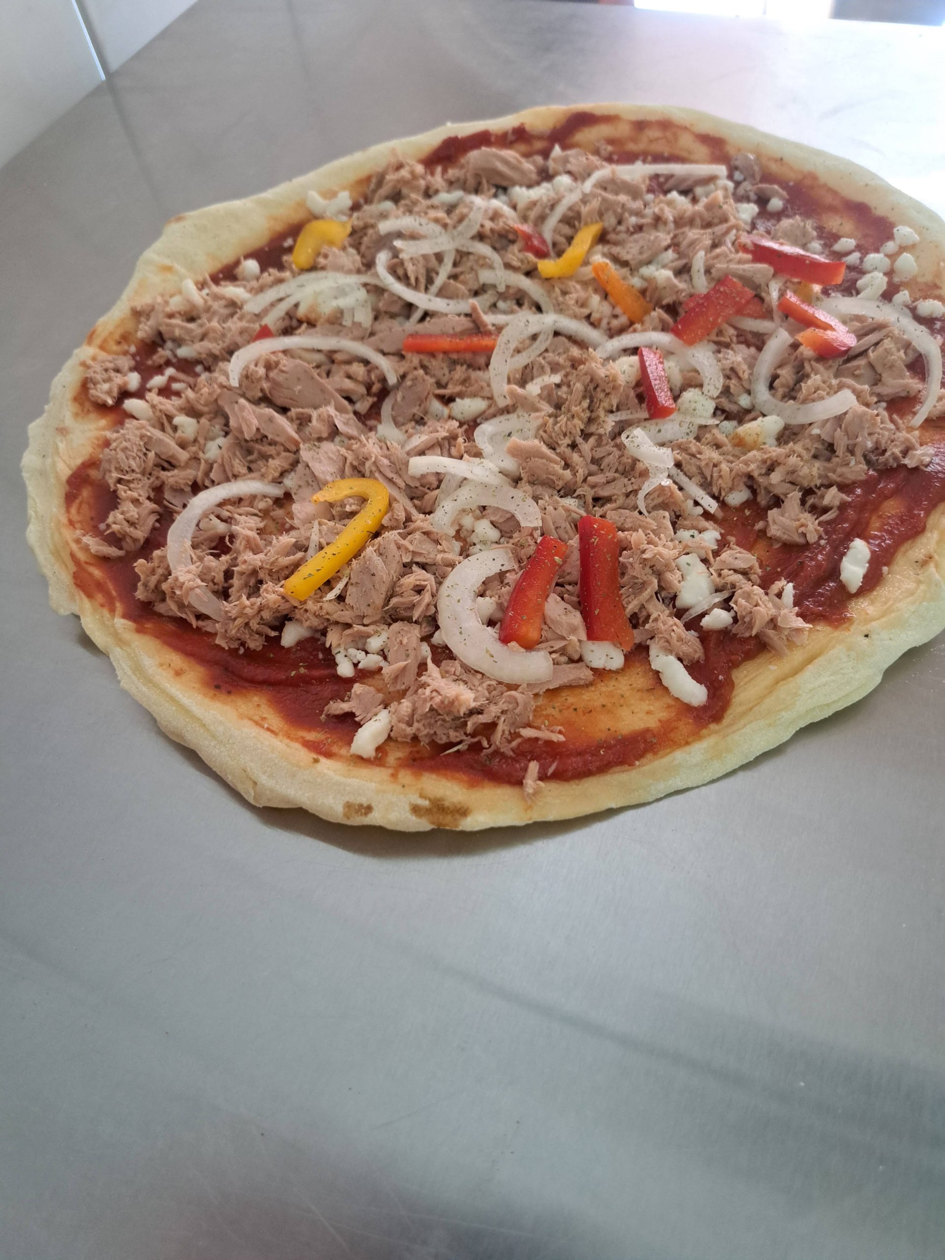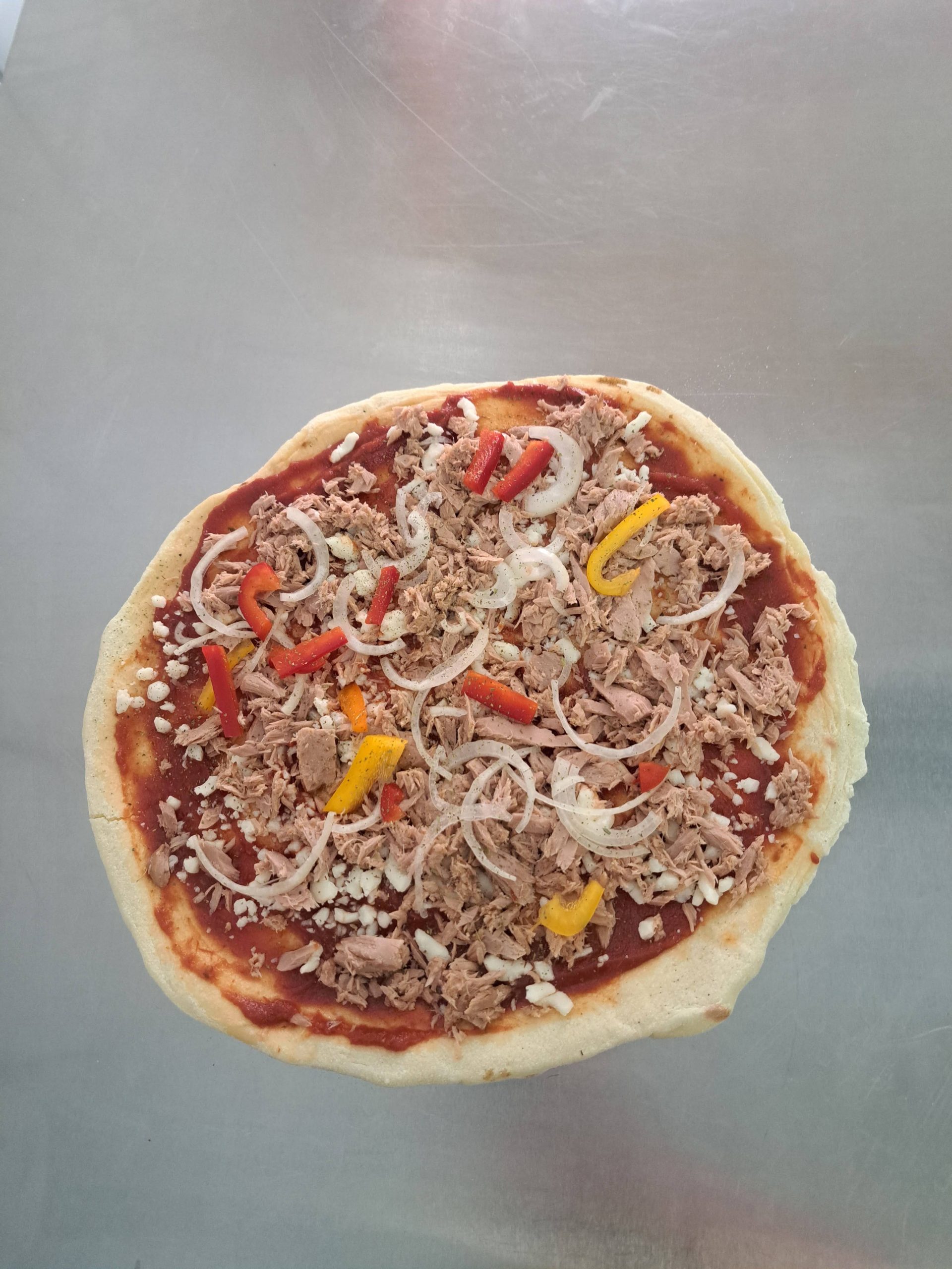 Ingrédient : Pâte à pizza , sauce tomate, Mozzarella Fior di latte, Thon, oignons, poivrons, origan